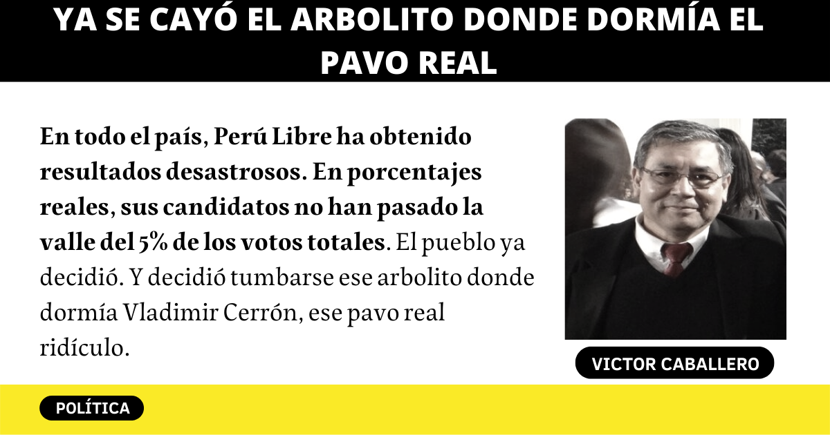 En total, en todo el país, Perú Libre ha obtenido resultados desastrosos. En porcentajes reales, sus candidatos no han pasado la valla del 5% de los votos totales. El pueblo ya decidió. Y decidió tumbarse ese arbolito donde dormía ese pavo real ridículo. Ahora va a tener que seguir purgando su pena por corrupción por el uso de fondos públicos, y seguirá enfrentando los nuevos casos de corrupción por asociación ilícita para delinquir.