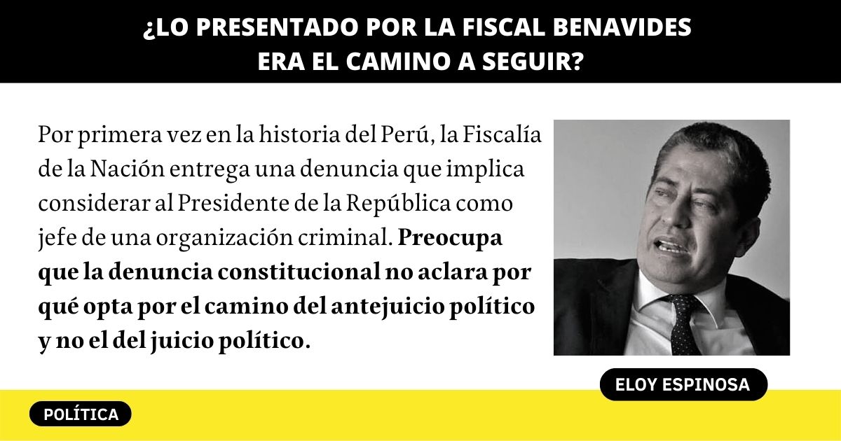 Por primera vez en la historia del Perú, la Fiscalía de la Nación entrega una denuncia que implica considerar al Presidente de la República como jefe de una organización criminal. Confieso que me preocupa que la denuncia constitucional presentada hoy ante el Congreso no aclara porqué opta por el camino del antejuicio político y no el del juicio político. Y eso es un error.